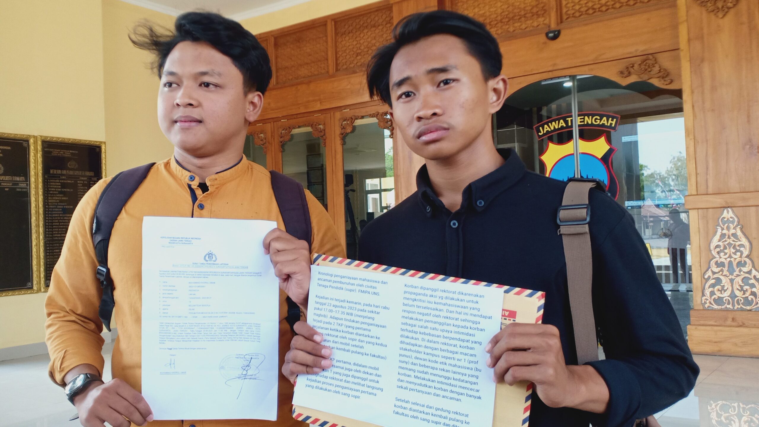 Khoirul Umam mahasiswa UNS (hitam) bersama temannya M Khairil ibadu Rahman di Mapolresta Solo, Kamis (24/08/2023) siang. (FOTO : Agung Santoso)