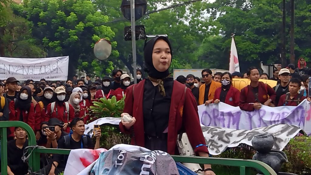 Salah satu peserta aksi, dari mahasiswi Institut Seni Indonesia Kota Solo, mengkritisi makanan bergizi sehat. Bahkan ada kepentingan besar dibalik efesiensi anggaran. Dalam orasi nya, mengkritisi kinerja polisi.
