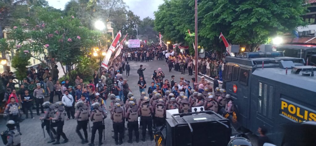 SOLO, solopopuler.com – Unjuk rasa digelar atas nama mahasiswa dengan berpakaian hitam didepan DPRD Kota Solo, Rabu (28/08/2024) sore. Mereka sebanyak ratusan mahasiswa kampus di Kota Solo sekitar ini menyampaikan kecaman ekspresif aparat dalam aksi serupa di daerah.